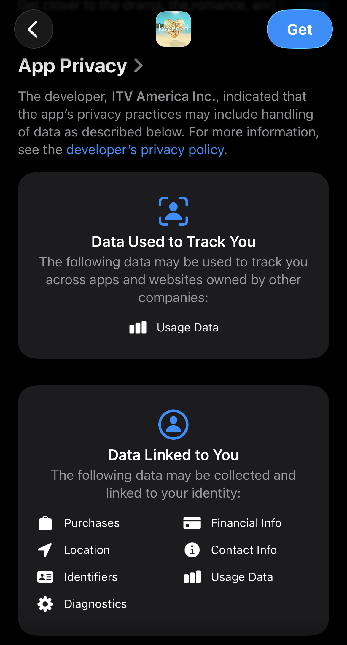 Oh P.S. As a viewer, to vote for your favorite contestants and couples, you need to download the Love Island App. Here is how the Apple App Store describes its data collection practices. Notably, 3 million unique individuals voted for the summer 2025 season of Love Island USA.