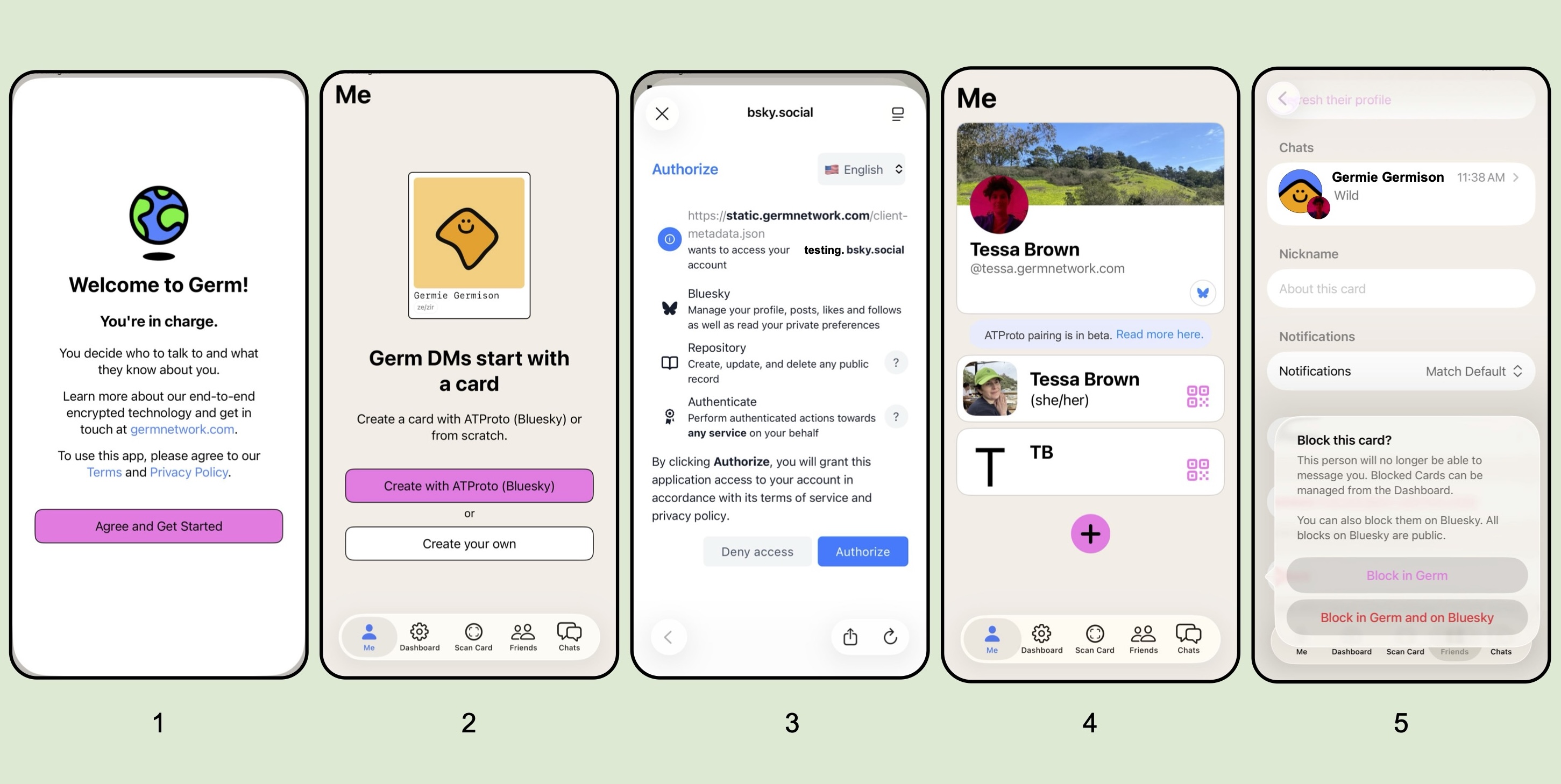 Part of this will come from the continued differentiation of AT Protocol as a brand, with a visual identity and UX language that all atproto apps, including Bluesky, can use to collectively identify what they're built on. We need to visually and linguistically communicate to users that we are all different applications pulling and pushing user data from a shared protocol. For Germ DM, that will make it easier to reflect what is and isn’t connected to your AT Protocol handle, and help people make informed decisions about what they’re sharing, how our app learned about them, and where this information is stored.